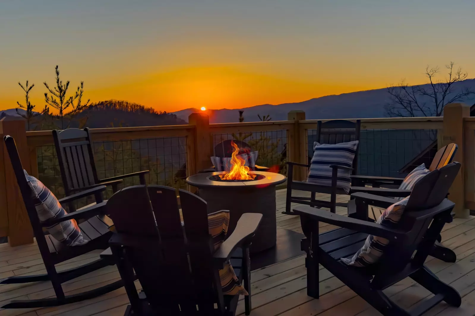 Step outside and towards the parking area you will find a 2 charcoal grills to enjoy a cook-out. To the left, you will be surprised by the large spacious deck area with comfortable seating, a gas fire pit, string lights and a large hot tub overlooking the amazing mountain views.